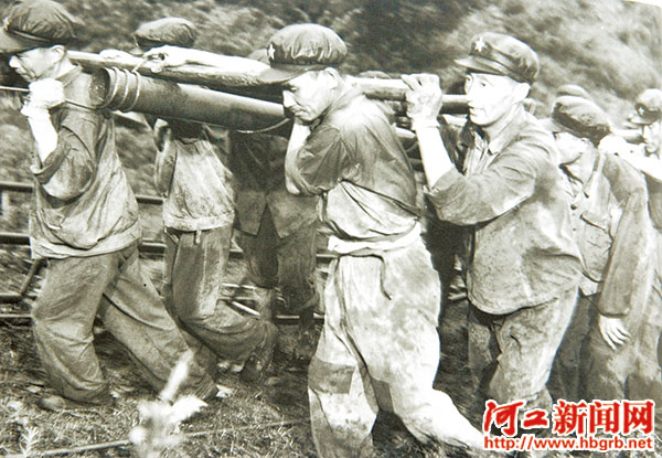 ■戰(zhàn)士們在抗美援越前線運(yùn)送鋼管等物資