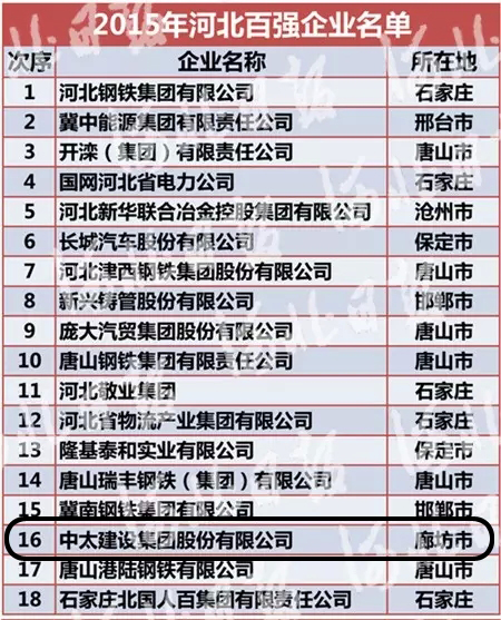 近日,由河北省工業(yè)經(jīng)濟(jì)聯(lián)合會(huì)主辦,省企業(yè)家協(xié)會(huì)、省企業(yè)聯(lián)合會(huì)和省統(tǒng)計(jì)學(xué)會(huì)協(xié)辦的2015年河北百?gòu)?qiáng)企業(yè)排序活動(dòng)圓滿落幕,經(jīng)層層評(píng)選審核、專(zhuān)家評(píng)審和社會(huì)公示等程序,最終揭曉結(jié)果。中太建設(shè)集團(tuán)再次榮膺“河北百?gòu)?qiáng)企業(yè)”(第16名),并在“河北省重點(diǎn)行業(yè)排頭兵企業(yè)”排名中榮獲建筑業(yè)第1名。