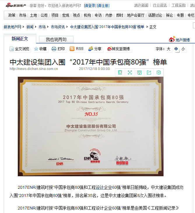 新浪網報道了“中太建設集團入圍“2017年中國承包商80強”榜單”