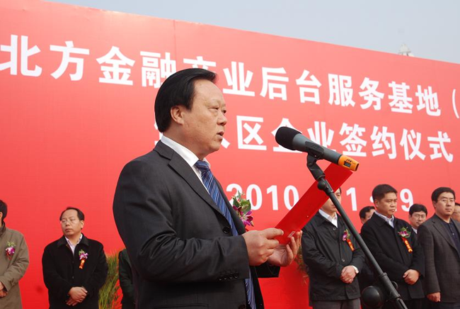 11月19日,經河北省人民政府批準,河北省“中國北方金融產業后臺服務基地(A區)”在中太現代服務業基地正式掛牌。省長助理、省金融辦主任江波、廊坊市市委書記趙世洪出席揭牌及入區項目簽約儀式并為基地揭牌。市長王愛民講話。市政府常務副市長吳立方、市委常委、組織部長范永錄等省市縣相關部門領導出席儀式。揭牌儀式由永清縣委書記布澤文主持。