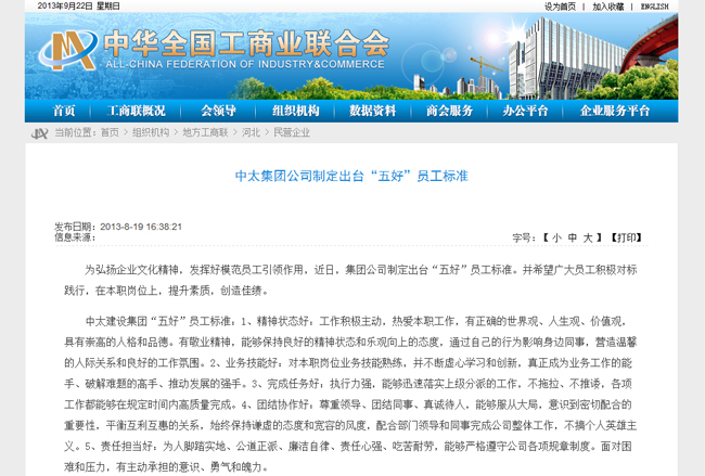 全國工商聯(lián)網(wǎng)站8月19日?qǐng)?bào)道了中太建設(shè)集團(tuán)制定出臺(tái)“五好”員工標(biāo)準(zhǔn)