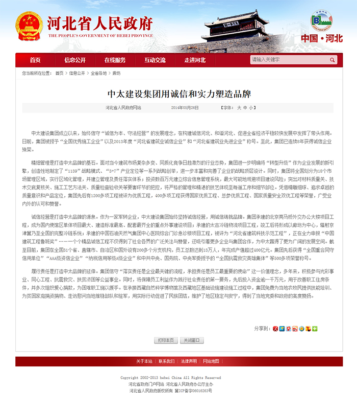 河北人民政府網(wǎng)站報(bào)道了中太建設(shè)集團(tuán)用誠(chéng)信和實(shí)力塑造品牌